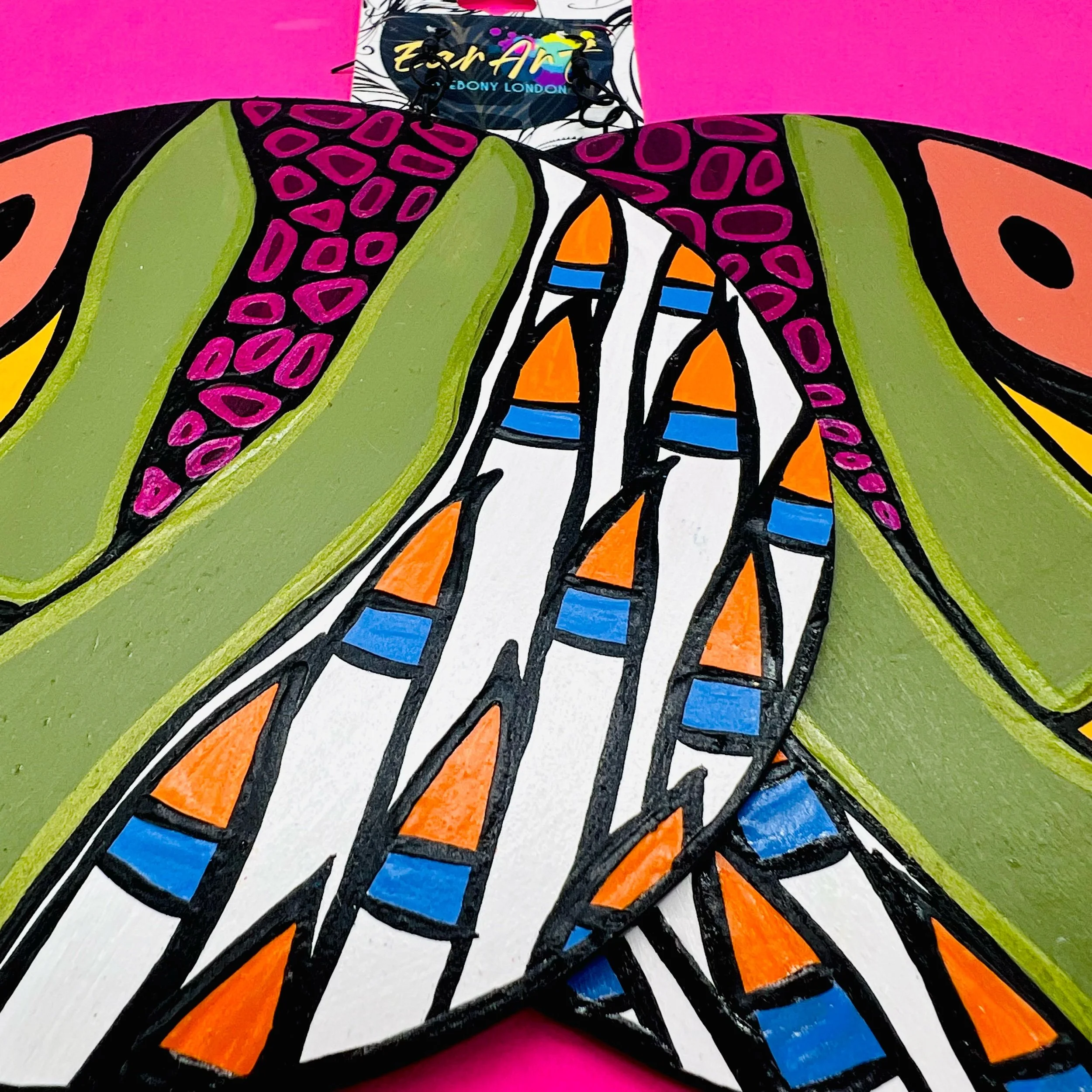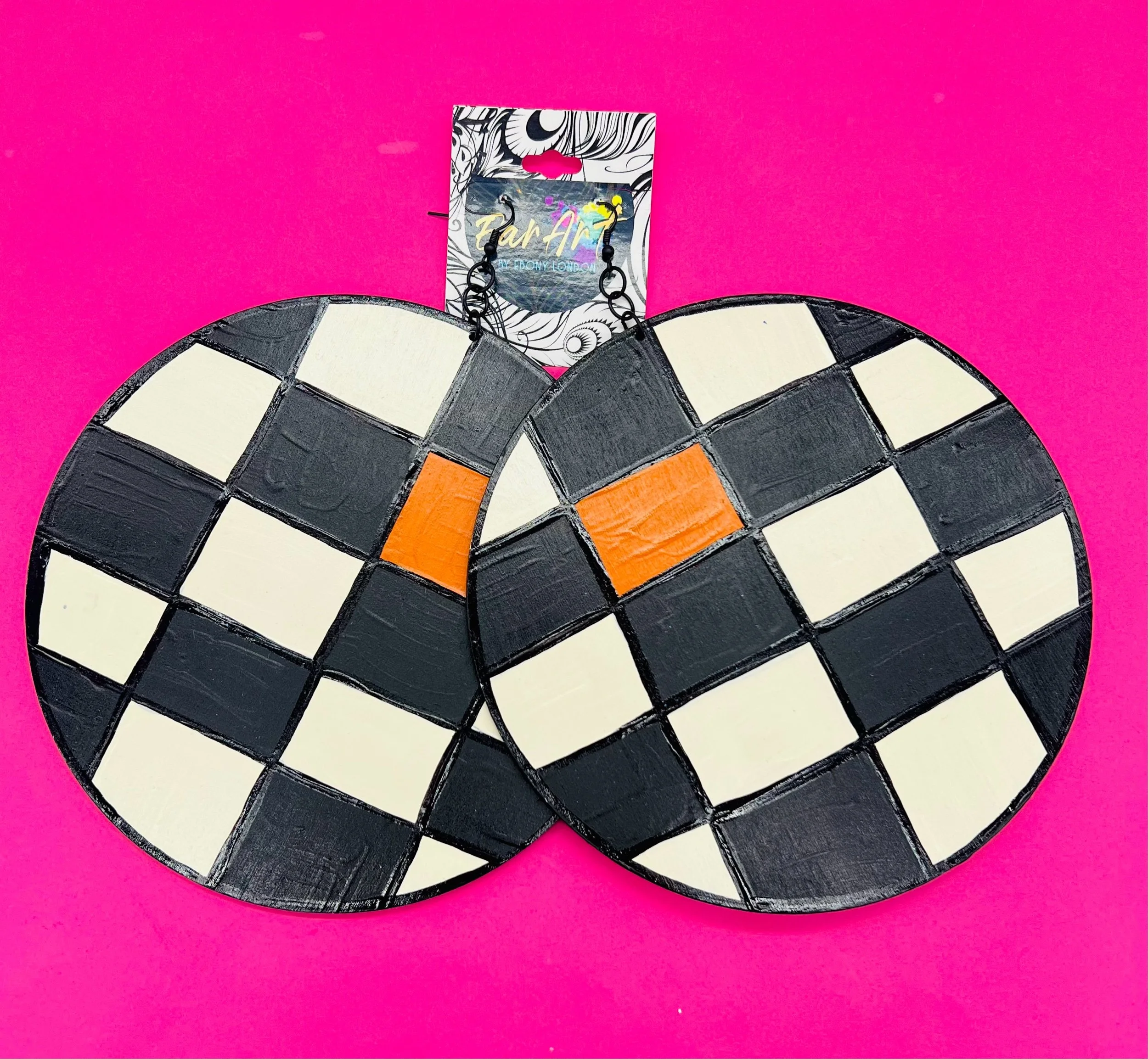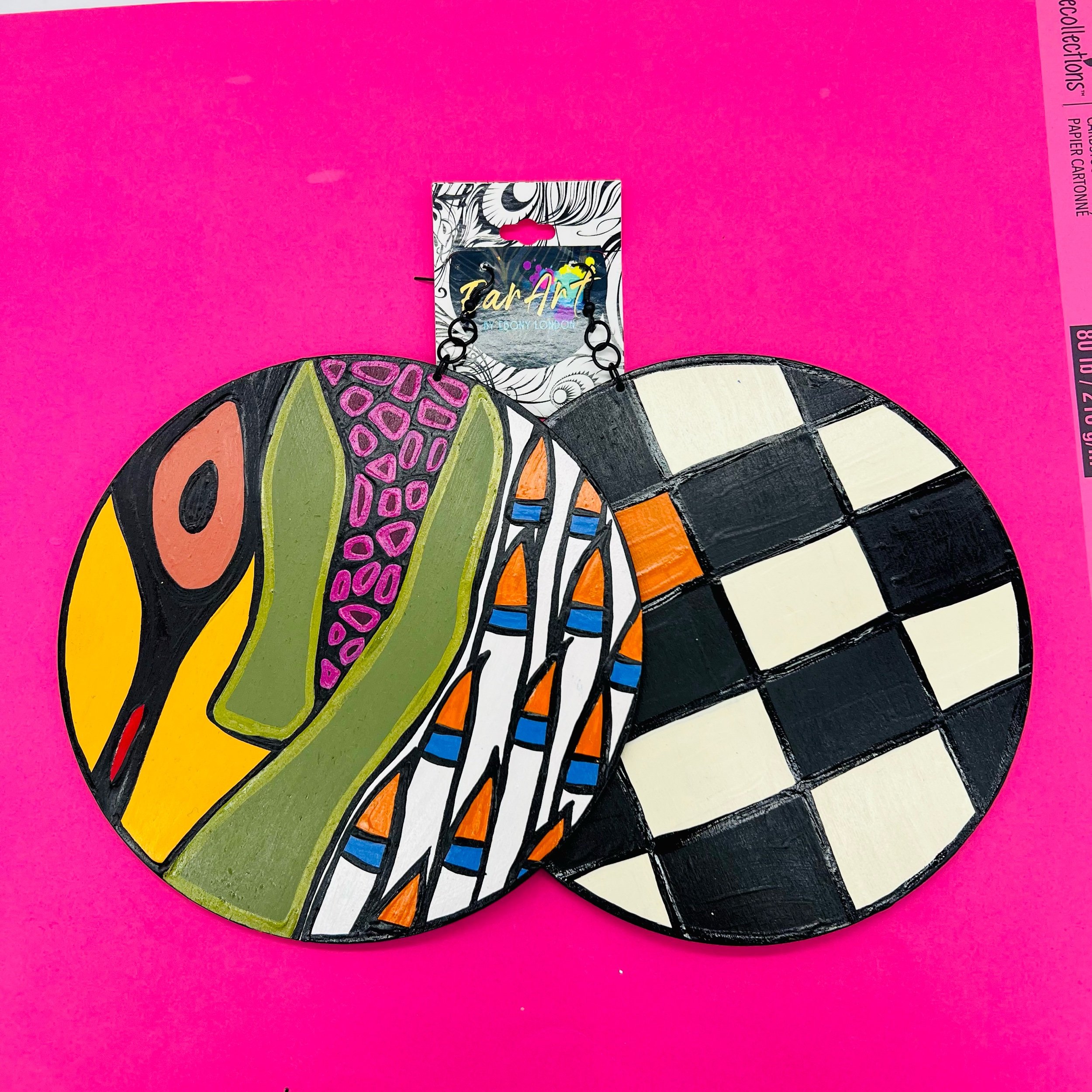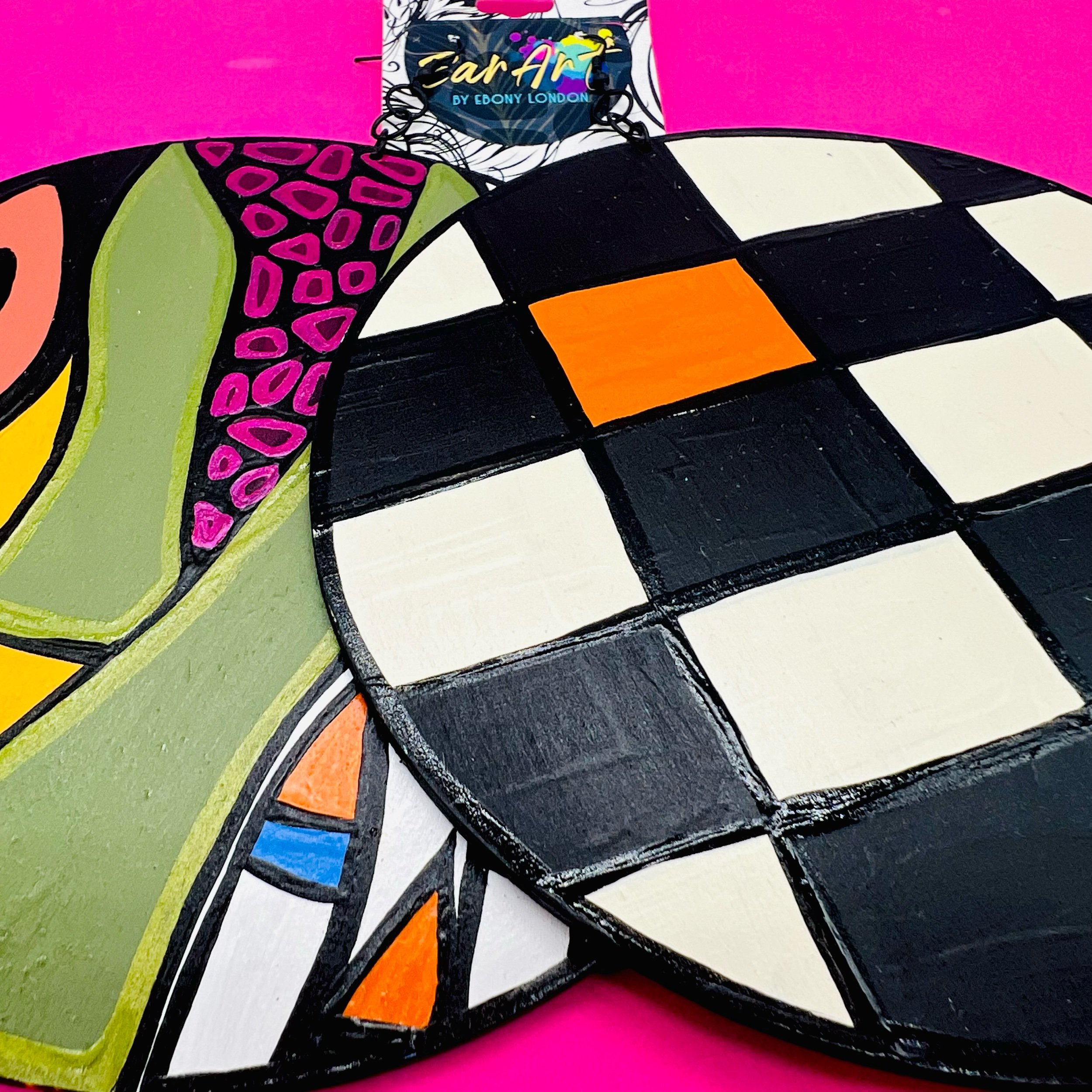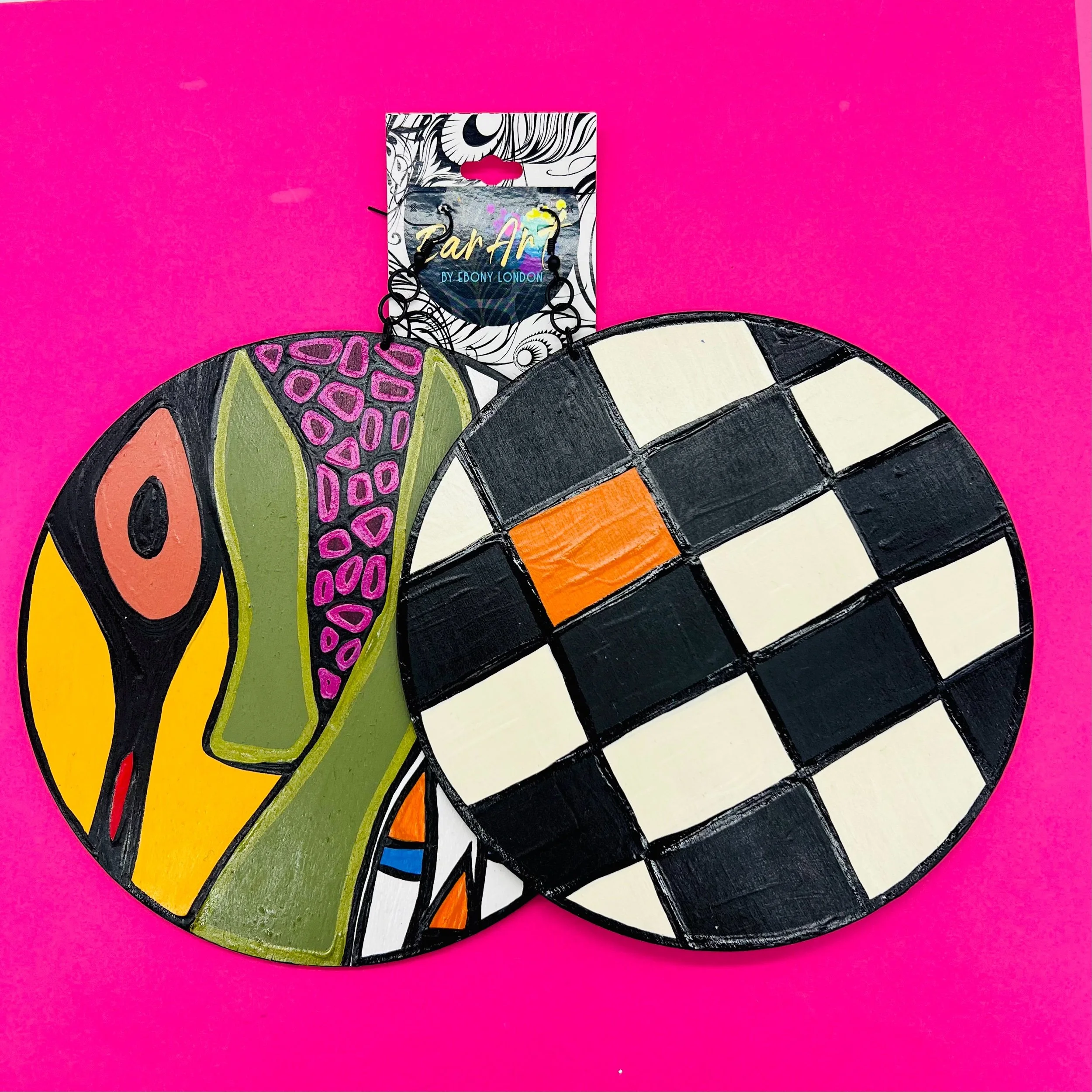 “Ear Art by Ebony London presents the Canvas Collection — a finite design series of bold, wearable art. Each pair features 6-inch diameter, lightweight wooden earrings, hand-painted with some of my most recognized patterns and signature color palettes.